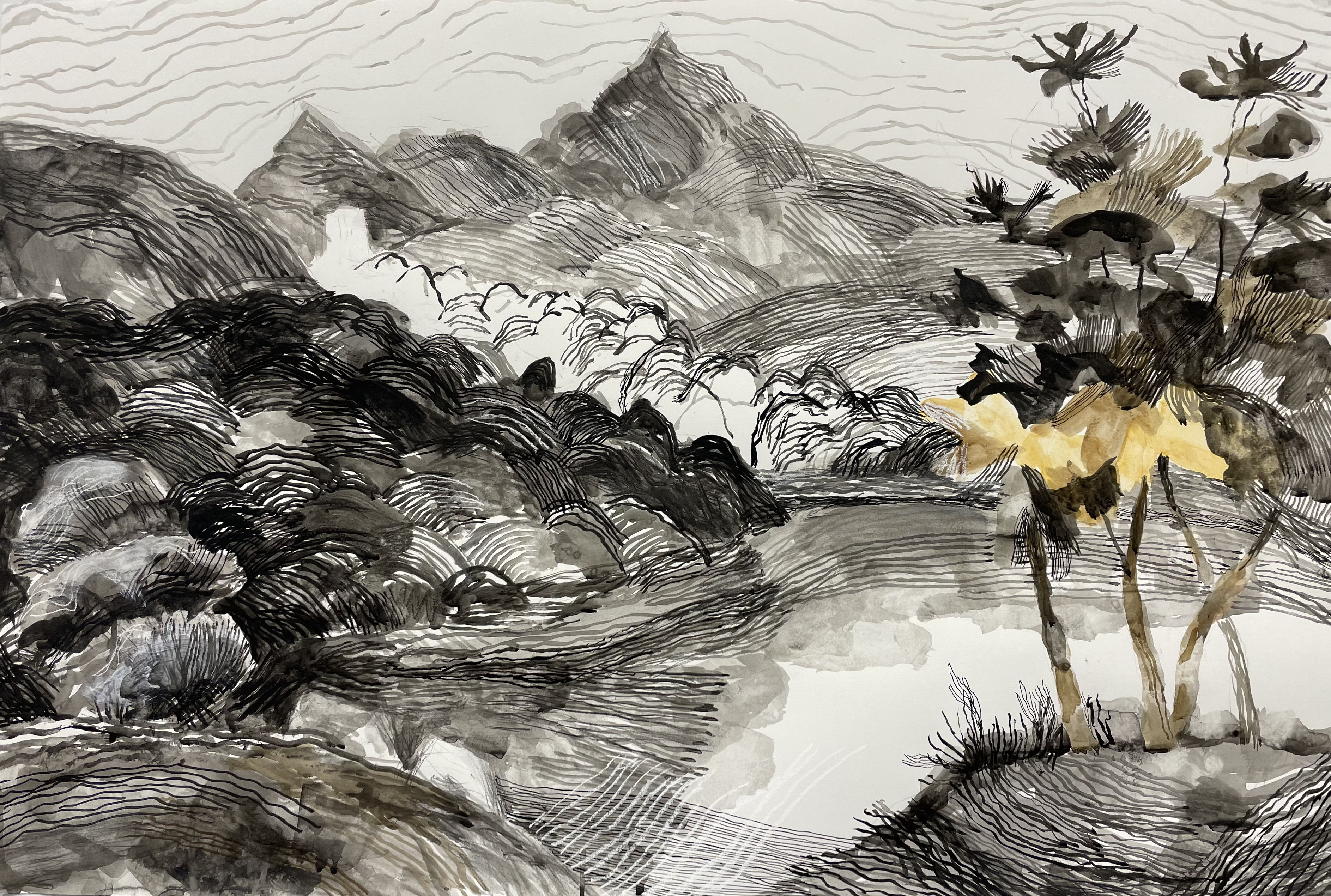 Eleri Mills lives and works in rural Mid Wales, where she was born and raised.  She has exhibited worldwide, and her work is in numerous national collections including the National Library of Wales. The Machynlleth Tabernacle Trust awarded her The Glyndwr Medal in 2023 for her outstanding contribution to the arts in Wales.  Her paintings depict a vision of Wales that is multi layered, highly personal, and timeless.  Influenced by bardic traditions, her landscapes have a dreamlike quality, rich in history and the mythology and spirit of a place.  There is a balance, rhythm and tempo to her work, akin to a musician performing or a poet composing a cynghanedd. Eleri’s paintings have a distinct colour palate of ochre, burnt orange, ultramarine and violet – inspiration she attributes to the Welsh painter James Dickson Innes. 'Llefydd Fwyll y Galon / Wild Places of the Heart I & II' (one of which is illustrated above) are inspired by the work of the great 18th century painters and their romantic interpretations of the Welsh landscape - people like Richard Wilson, Thomas Jones Pencerrig, Edward Pugh, and Samuel and Nathaniel Buck. We are thrilled to be featuring a selection of her stunning quiet, narrative work in this our first Summer Show.